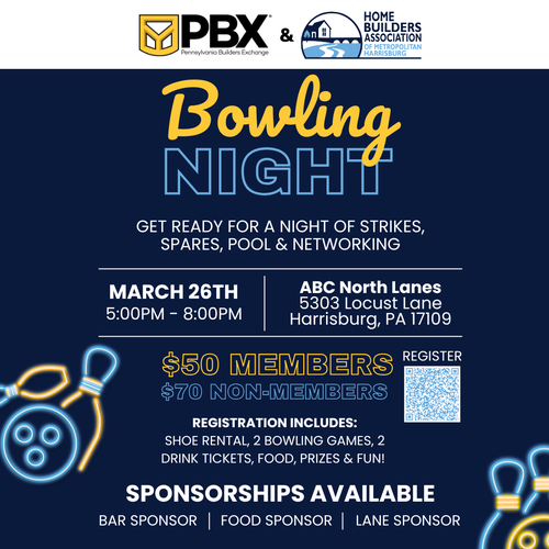 Join the Home Builders Association of Metropolitan Harrisburg and the Pennsylvania Builders Exchange (PBX) for a fun-filled evening for Bowling! A night with great food, drinks, bowling and networking opportunities.